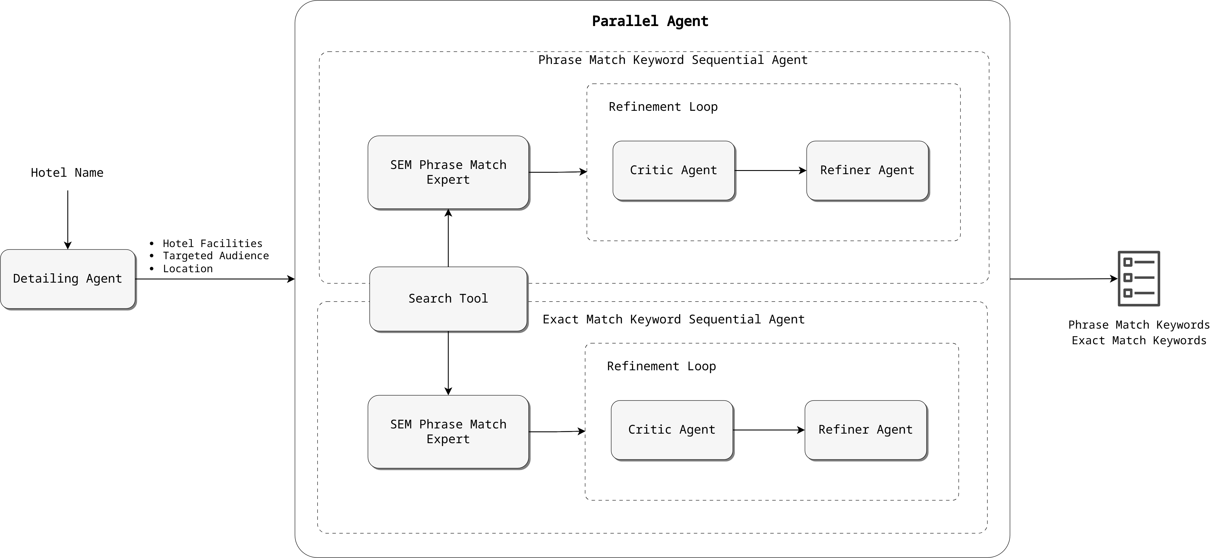 The detailed information is then passed to a parallel processing workflow to generate both "Phrase Match" and "Exact Match" keywords simultaneously. Each parallel track is managed by a dedicated "Expert Agent" (e.g., a "Phrase Match Expert"). These agents are armed with two key assets: the detailed hotel information from the first step and a deep knowledge base of best practices for their specific keyword type. They also use the search tool to find timely information about local events or conferences happening near the hotel.