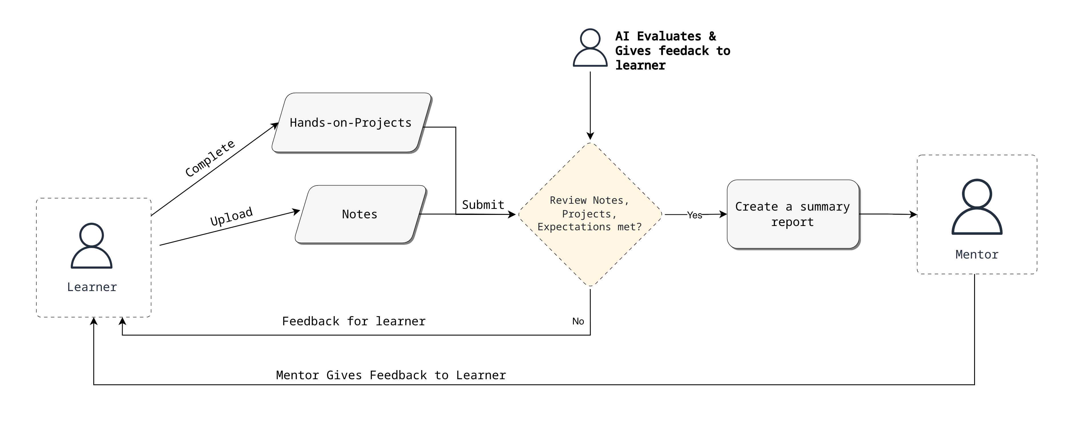 Once a learner completes all modules, the mentor has access to a comprehensive overview of their entire learning journey. This allows mentors to bypass granular, repetitive checks and focus their time on high-impact, strategic conversations, preparing the learner for the final project phase.